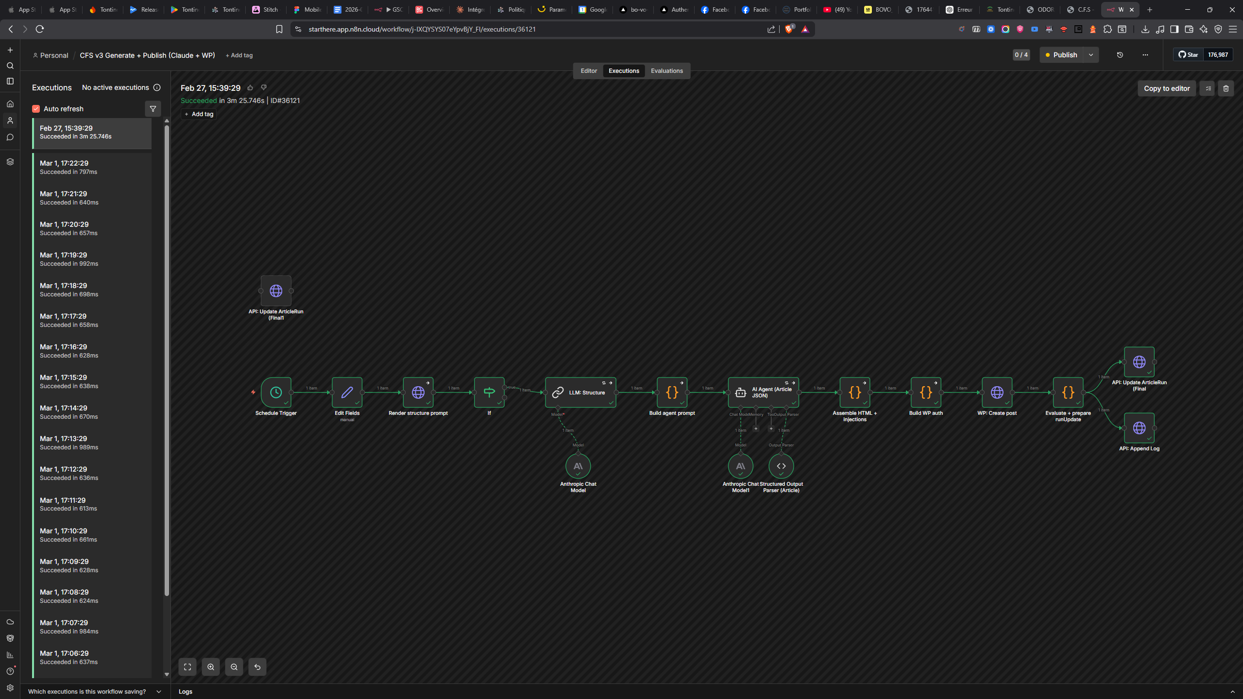 Once the article is generated (with dynamic injection of local tags and optimized Hn), n8n does not ask for human authorization: it pushes the formatted article directly onto the target site's CMS via API.
