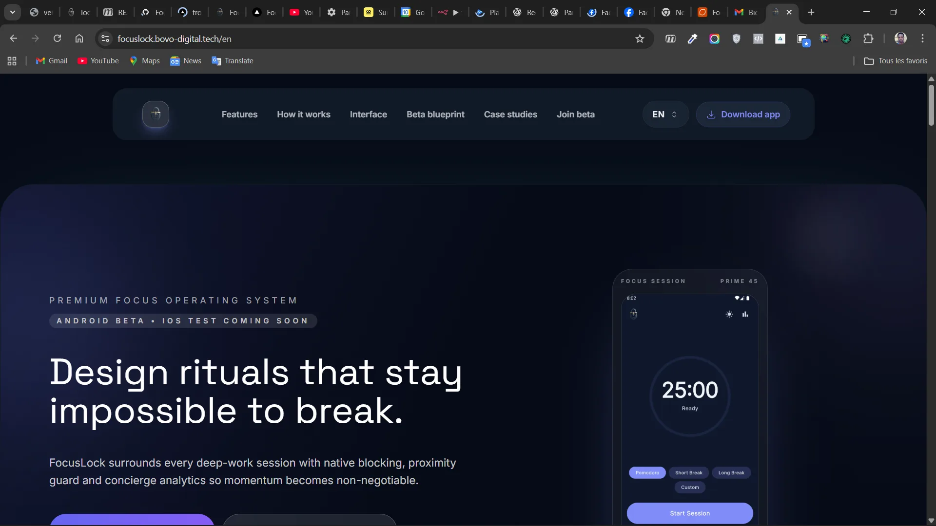 Landing page premium développée avec Next.js 16 (App Router) et React 19 pour présenter FocusLock, un système d'exploitation de concentration de niveau professionnel. Cette application web offre une expérience utilisateur exceptionnelle avec un design dark exclusif et une internationalisation complète.