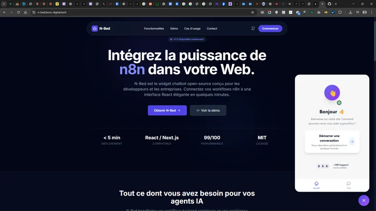 Un widget chatbot production-ready, entièrement isolé et configurable, permettant d'ajouter un assistant conversationnel à n'importe quel site web en quelques minutes. La solution est entièrement documentée et accessible sur https://n-bed.bovo-digital.tech/