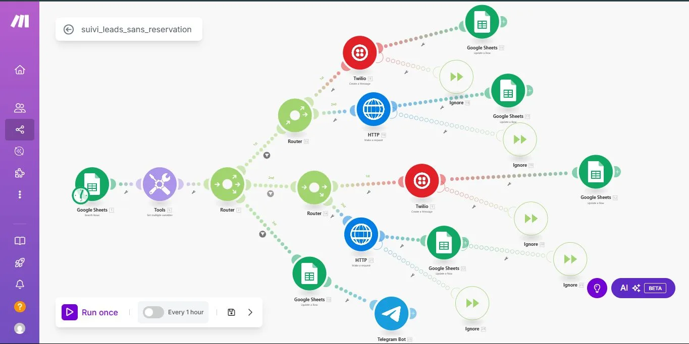 Détection des liens non cliqués Make.com vérifie régulièrement dans Google Sheets quels prospects ont reçu leur lien Calendly sans l'avoir utilisé pour réserver.