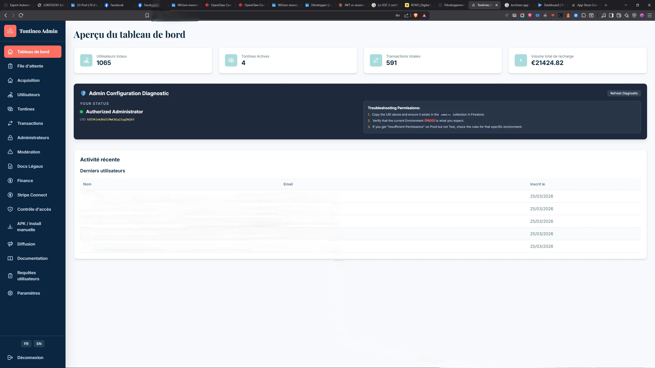 Backoffice complet pour Tontineo : gestion des utilisateurs, tontines, transactions, waitlist, permissions et configuration Stripe/Twilio depuis un tableau de bord centralisé.