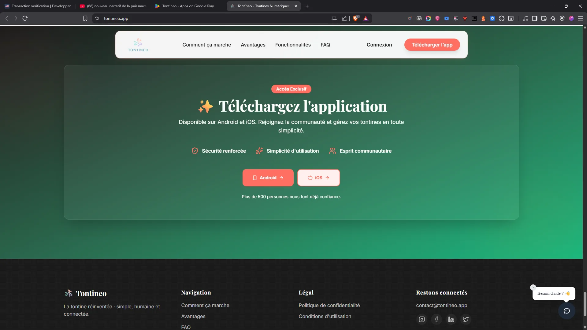 Cette landing page sert de vitrine digitale pour Tontineo, présentant de manière attractive les avantages de l'application et incitant les visiteurs à la télécharger.